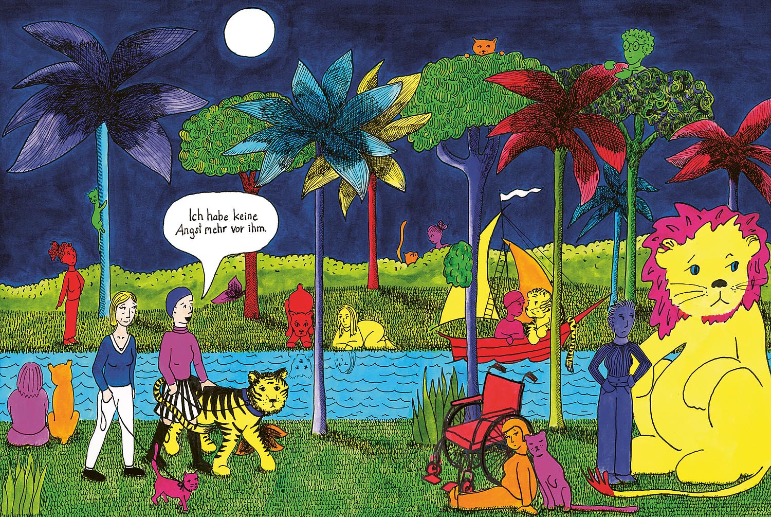Ein für alle passendes Standardwerk kann es jedoch nicht sein, weiß Grashoff. Dafür sorgt nicht nur das für manche ungewohnte Format der Graphic Novel, sondern auch der Charakter der Krankheit: “Zwei Frauen, das bedeutet bei einer Brustkrebs-Erkrankung immer auch zwei unterschiedliche Wege, damit umzugehen, sowohl emotional als auch mit Blick auf die Therapie.” Im Buch veranschaulichen dies Katzen: Brustkrebs kann eine zahme, sich anschmiegende Hauskatze sein – oder ein wilder Tiger.