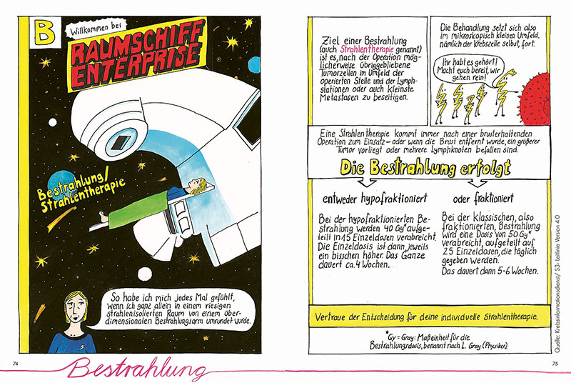 Hinzu kommen zahlreiche sehr konkrete Tipps für Betroffene und Ärzte, von Behandlungsmethoden gegen die Übelkeit während der Chemo bis zum Gedanken an eine Kryokonservierung für junge Frauen mit Kinderwunsch. “Es gibt Kühlhauben, die während der Chemo den Haarverlust reduzieren können”, wirft eine Patientin auf dem Papier ein. Und auch ein vermeintliches Tabu-Thema wie das Sexleben während und nach der Behandlung greifen die beiden auf.