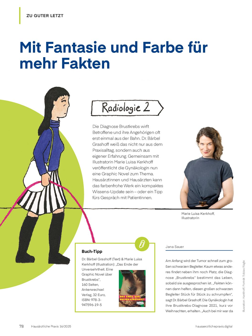 Die Diagnose Brustkrebs wirft Betroffene und ihre Angehörigen oft erst einmal aus der Bahn. Dr. Bärbel Grashoff weiß das nicht nur aus dem Praxisalltag, sondern auch aus eigener Erfahrung. Gemeinsam mit Illustratorin Marie Luisa Kerkhoff veröffentlicht die Gynäkologin nun eine Graphic Novel zum Thema. Hausärztinnen und Hausärzten kann das farbenfrohe Werk ein kompaktes Wissens-Update sein – oder ein Tipp fürs Gespräch mit Patientinnen.