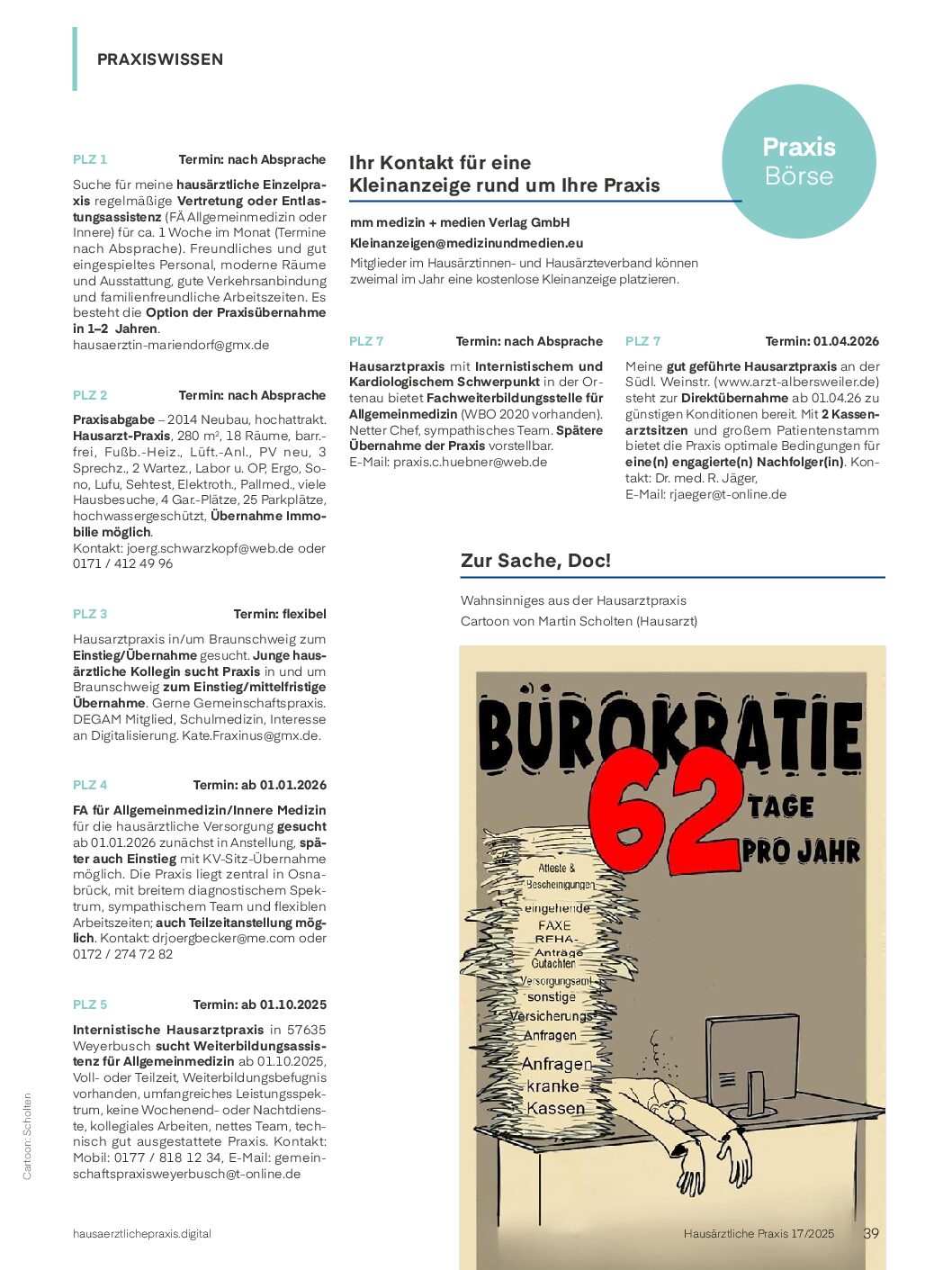 Meine gut geführte Hausarztpraxis an der Südl. Weinstr. (www.arzt-albersweiler.de) steht zur Direktübernahme ab 01.04.26 zu günstigen Konditionen bereit. Mit 2 Kassenarztsitzen und großem Patientenstamm bietet die Praxis optimale Bedingungen für eine(n) engagierte(n) Nachfolger(in). Kontakt: Dr. med. R. Jäger, E-Mail: rjaeger@t-online.de