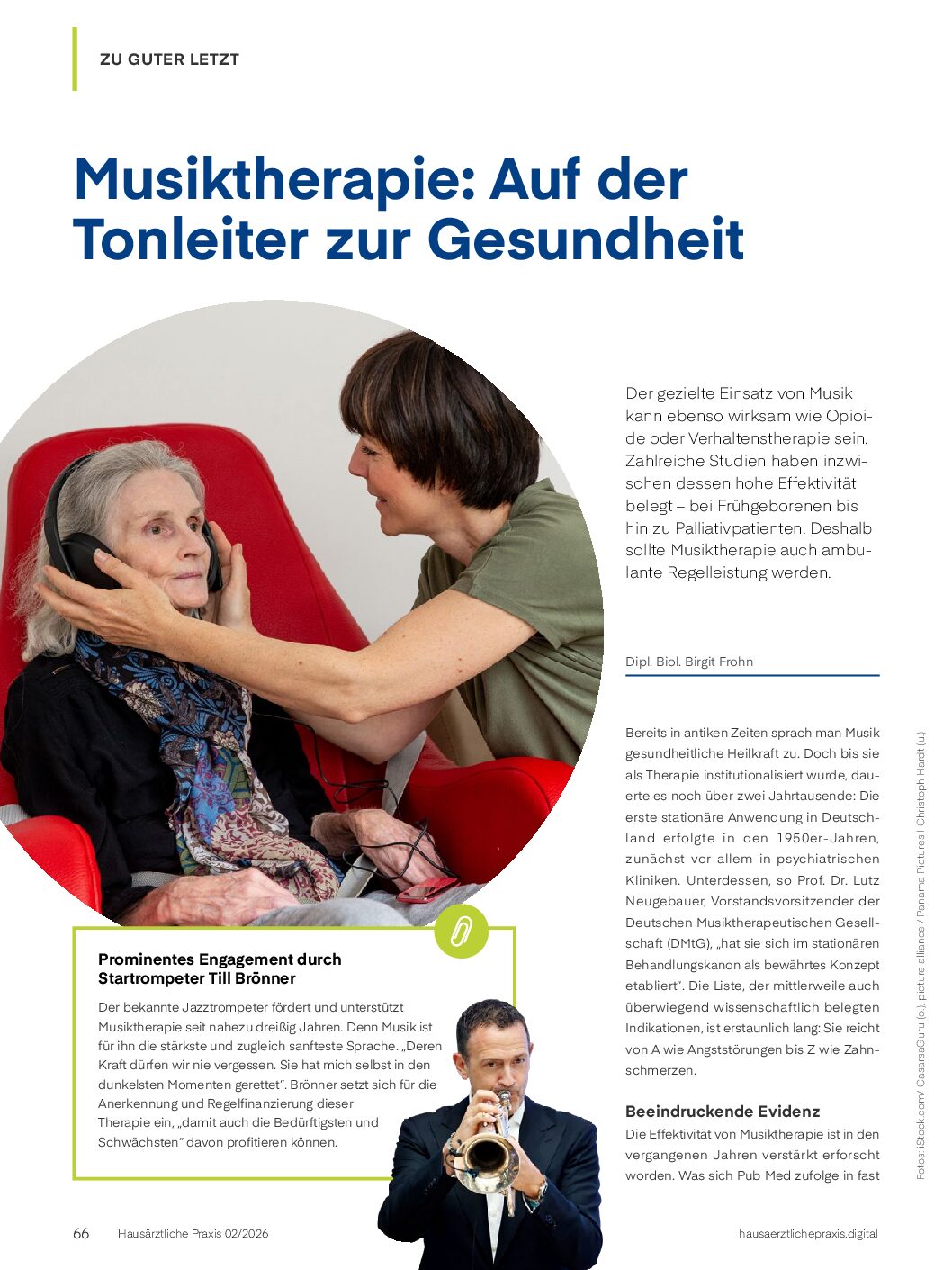 Der gezielte Einsatz von Musik kann ebenso wirksam wie Opioide oder Verhaltenstherapie sein. Zahlreiche Studien haben inzwischen dessen hohe Effektivität belegt – bei Frühgeborenen bis hin zu Palliativpatienten. Deshalb sollte Musiktherapie auch ambulante Regelleistung werden.