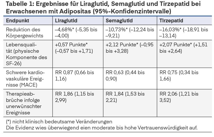© Hausärztliche PraxisErgebnisse für Liraglutid, Semaglutid und Tirzepatid bei Erwachsenen mit Adipositas (95%-Konfidenzintervalle)