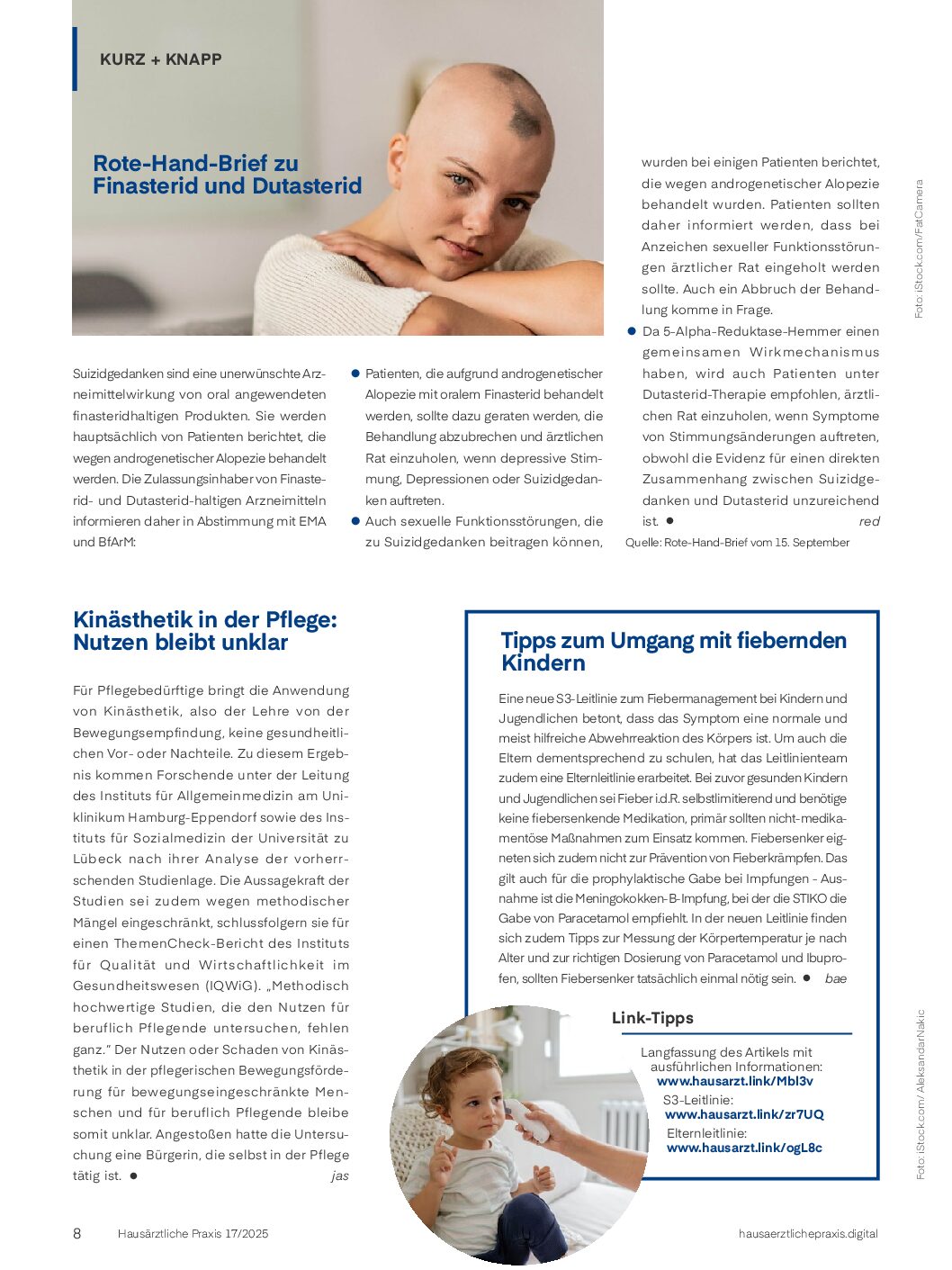 - Auch sexuelle Funktionsstörungen, die zu Suizidgedanken beitragen können, wurden bei einigen Patienten berichtet, die wegen androgenetischer Alopezie behandelt wurden. Patienten sollten daher informiert werden, dass bei Anzeichen sexueller Funktionsstörungen ärztlicher Rat eingeholt werden sollte. Auch ein Abbruch der Behandlung komme in Frage.