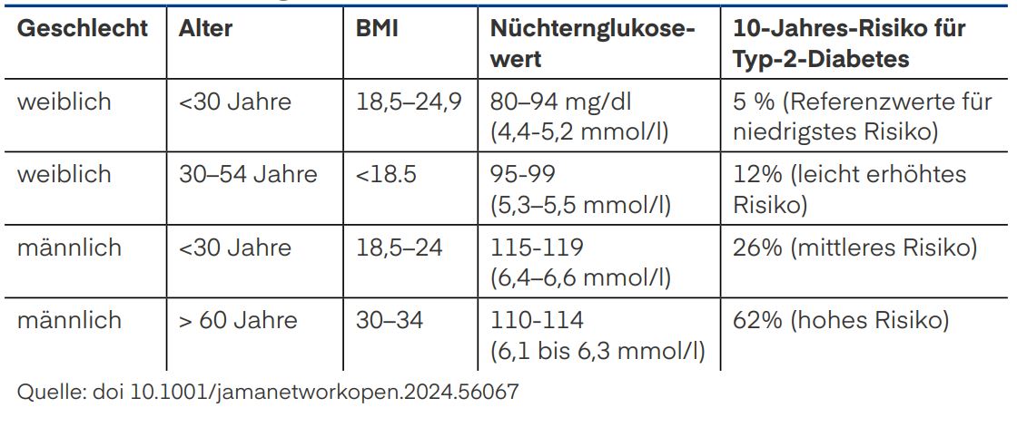 Das Risiko, in den nächsten zehn Jahren an Diabetes zu erkranken, lässt sich mit wenigen Routineparametern – Nüchternblutzucker, Alter, Geschlecht und Body-Mass-Index (BMI) – vorhersagen. Das geht aus einer Studie hervor, für die ein Forschungsteam aus den USA retrospektiv Daten von rund 45.000 Menschen zwischen 18 und 65 Jahren ausgewertet hat. Zu Studieneinschluss wurden Nüchternblutzucker, Alter, Geschlecht und BMI erfasst und über im Mittel sieben Jahre verfolgt, welche Teilnehmenden an Diabetes erkrankten.