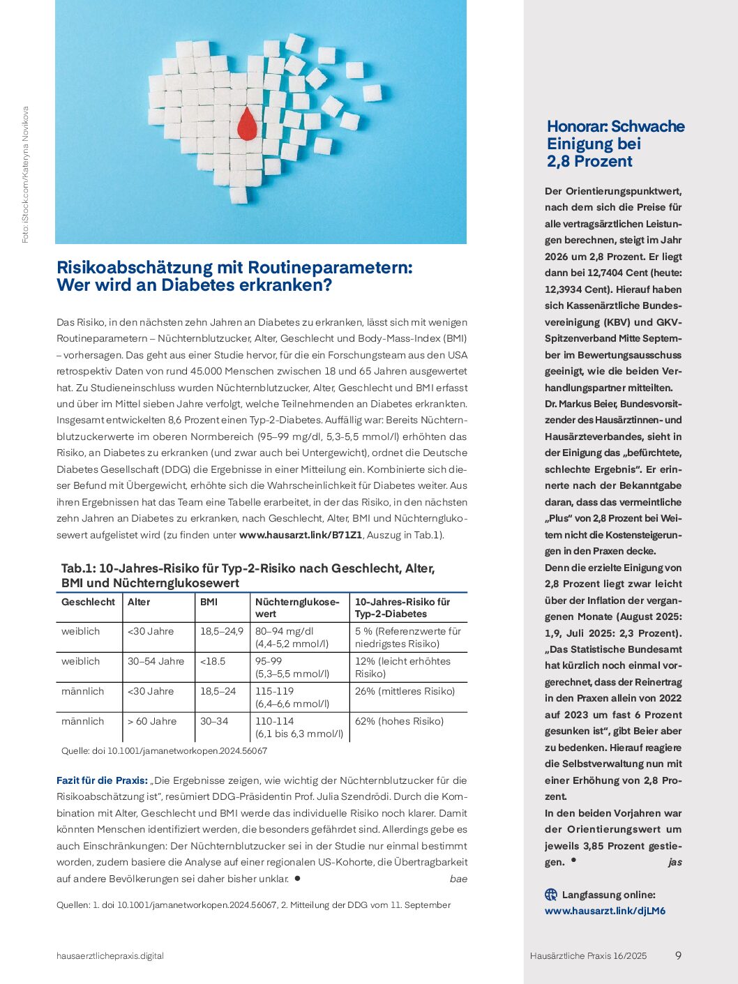 Kombinierte sich dieser Befund mit Übergewicht, erhöhte sich die Wahrscheinlichkeit für Diabetes weiter. Aus ihren Ergebnissen hat das Team eine Tabelle erarbeitet, in der das Risiko, in den nächsten zehn Jahren an Diabetes zu erkranken, nach Geschlecht, Alter, BMI und Nüchternglukosewert aufgelistet wird (zu finden unter www.hausarzt.link/B71Z1, Auszug in Tab.1).