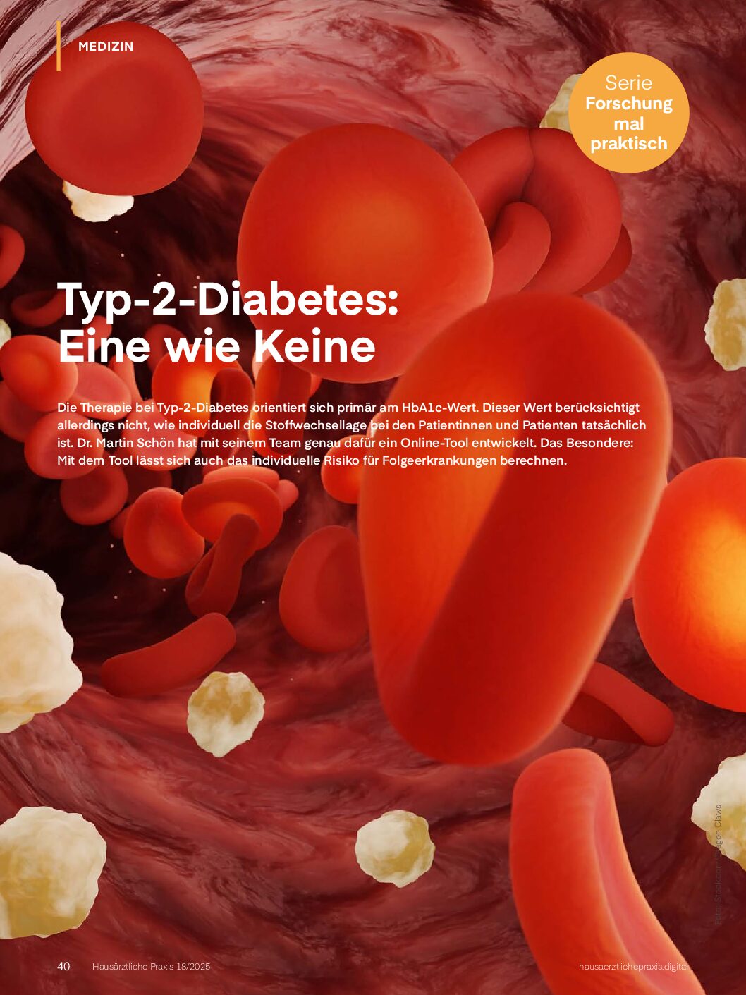 Die Therapie bei Typ-2-Diabetes orientiert sich primär am HbA1c-Wert. Dieser Wert berücksichtigt allerdings nicht, wie individuell die Stoffwechsellage bei den Patientinnen und Patienten tatsächlich ist. Dr. Martin Schön hat mit seinem Team genau dafür ein Online-Tool entwickelt. Das Besondere: Mit dem Tool lässt sich auch das individuelle Risiko für Folgeerkrankungen berechnen.