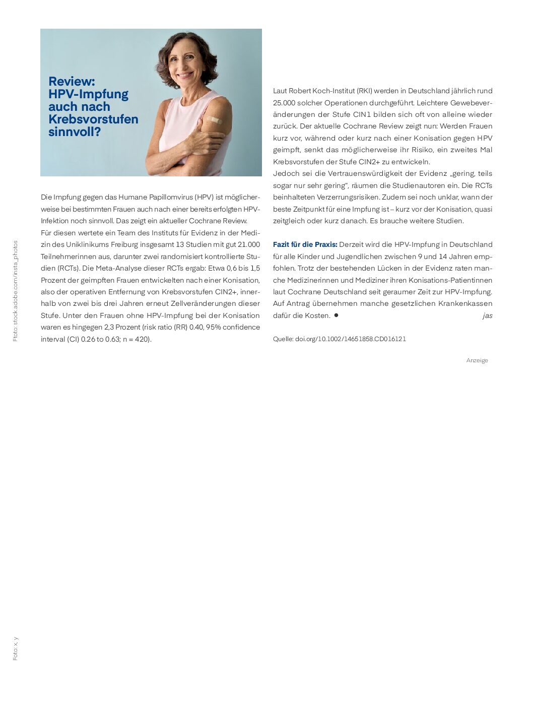 Fazit für die Praxis: Derzeit wird die HPV-Impfung in Deutschland für alle Kinder und Jugendlichen zwischen 9 und 14 Jahren empfohlen. Trotz der bestehenden Lücken in der Evidenz raten manche Medizinerinnen und Mediziner ihren Konisations-Patientinnen laut Cochrane Deutschland seit geraumer Zeit zur HPV-Impfung. Auf Antrag übernehmen manche gesetzlichen Krankenkassen dafür die Kosten.• jas