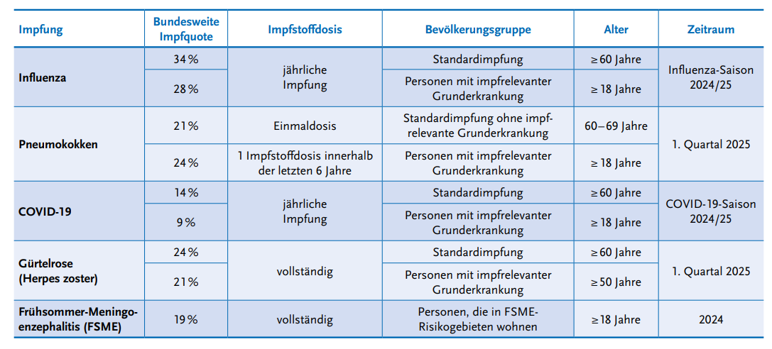 - Lückenhafte Auffrischimpfung gegen Diphtherie, Tetanus, Pertussis (DTP) und Polio: Erstmals wurden die Impfquoten für die Auffrischimpfungen im Kindes- und Jugendalter berechnet. Die Impfquote der im Alter von 5–6 Jahren empfohlenen Auffrischimpfung gegen DTP lag 2024 bei 6-Jährigen bei nur 50 Prozent. Die für das Alter von 9–16 Jahren empfohlene Auffrischimpfung gegen DTP und Polio wurde von 57 Prozent der 15-Jährigen wahrgenommen. Bei jedem zehnten dieser Jugendlichen fehlte bei der Auffrischimpfung jedoch die Polio-Impfstoffkomponente. Nur 43 Prozent der Jugendlichen hatten sowohl die Auffrischimpfung im Kindesalter als auch die im Jugendalter erhalten. Im Hinblick auf den Nachweis von Impfstoff-abgeleiteten Polioviren im Abwasser mehrerer deutscher Städte seit Ende 2024 sowie kürzlich dem Nachweis von Polio-Wildviren vom Typ 1 im Abwasser in Hamburg sollten Impflücken dringend geschlossen werden, betont das RKI. Das Institut erinnert zudem daran, dass im Jahr 2025 bei einem bundesweiten Diphtherie-Ausbruch ein ungeimpftes Kind an respiratorischer Diphtherie starb, ebenso zwei ältere Menschen.