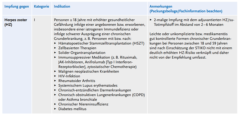 Die STIKO weist darauf hin, dass die Indikationsgruppen der Empfehlung in Abhängigkeit von der zugrundeliegenden Erkrankung ein unterschiedlich hohes Risiko aufweisen, an HZ zu erkranken. “Am höchsten ist das Risiko bei Personen mit angeborener oder erworbener Immundefizienz (z.B. Patientinnen und Patienten nach hämatopoetischer Stammzelltransplantation sowie bei Personen mit bestimmten Autoimmunerkrankungen (z. B. systemischer Lupus erythematodes) oder deren Therapien (z.B. Rituximab).”
