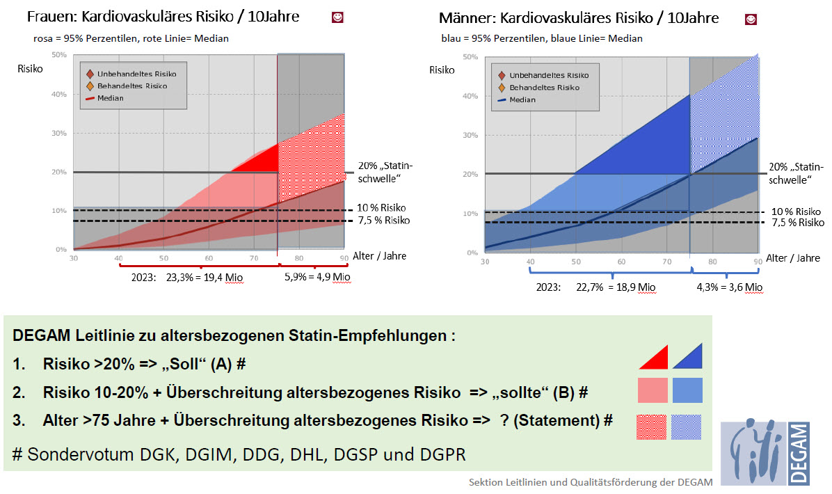 Ebenso unverändert spricht sich die DEGAM negativ zu Screenings mittels koronarem Kalkscore, der Dickemessung der Intima media, der Albuminurie-Bestimmung, hochsensitivem CRP, Knöchel-Arm-Index oder Lipoprotein(a) aus. Dies sieht die Deutsche Gesellschaft für Innere Medizin (DGIM) mitunter anders. Auch anderer Meinung ist die DGIM bekanntermaßen in der Statintherapie, etwa der Strategie der fixen Dosis sowie dem Einsatz von Statinen ab 75 Jahren.