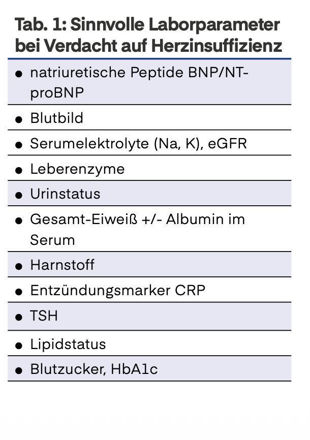 Nach klinischer Diagnose einer Herzinsuffizienz kann diese durch die Bestimmung des Serummarkers NT-proBNP untermauert werden. Außerdem erhalten Patientinnen und Patienten mit klar erhöhtem NT-proBNP einen raschen Termin in der kardiologischen Facharztpraxis. Ein normaler Wert spricht dagegen für eine extrakardiale Genese. Im beschriebenen Fall liegt bei Beschwerden bereits bei geringer Belastung ein klinisches NYHA-Stadium 3 vor.