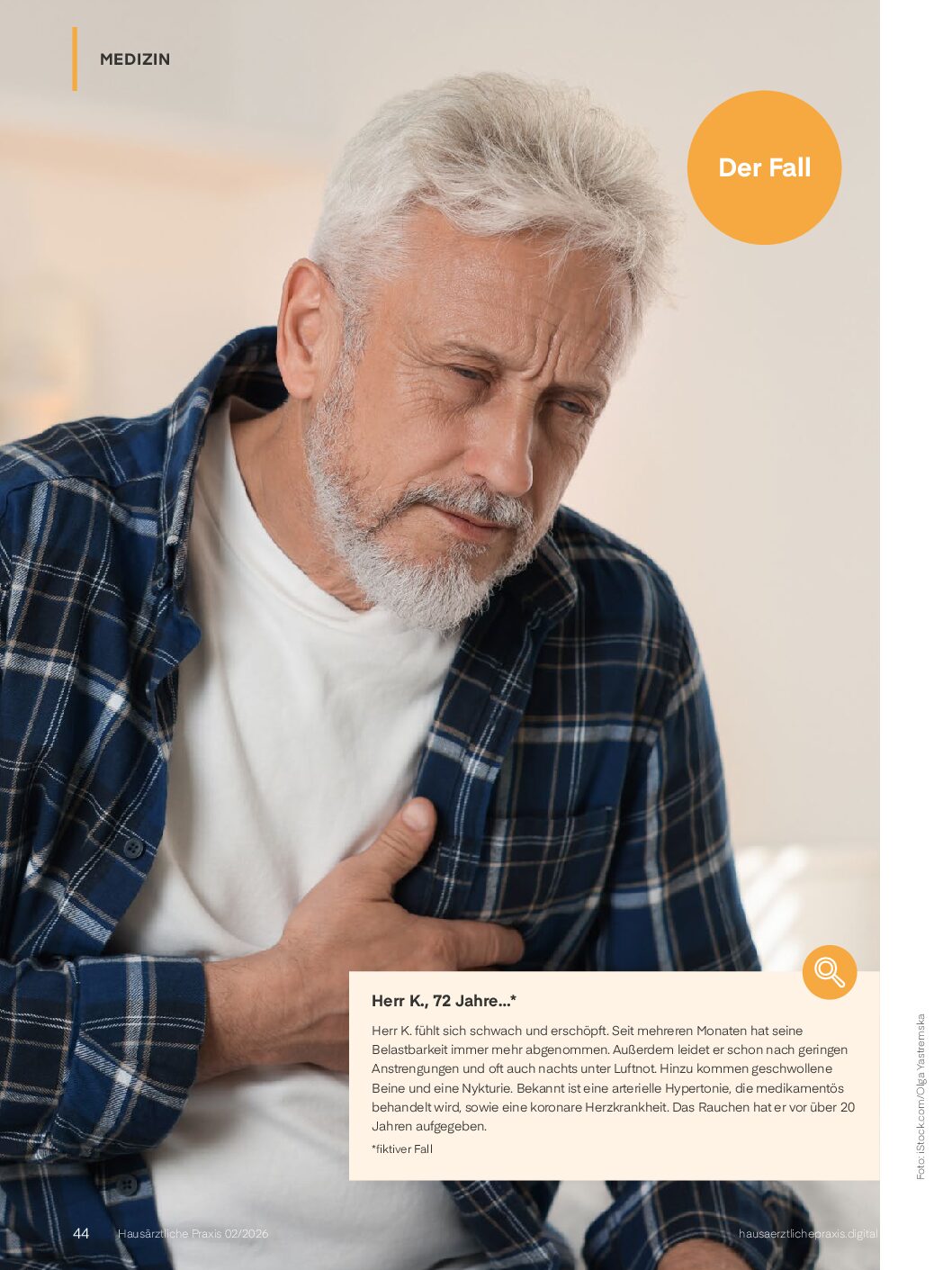 Die Beschwerden von Herrn K. deuten in der Summe auf die Diagnose “chronische Herzinsuffizienz” hin. Typisch sind das Entstehen über Monate, die Belastungsintoleranz, der Leistungsknick sowie die paroxysmale nächtliche Dyspnoe und Nykturie bei peripheren Ödemen. Die KHK ist einer der häufigsten Risikofaktoren für das Neuauftreten von Herzinsuffizienz.
