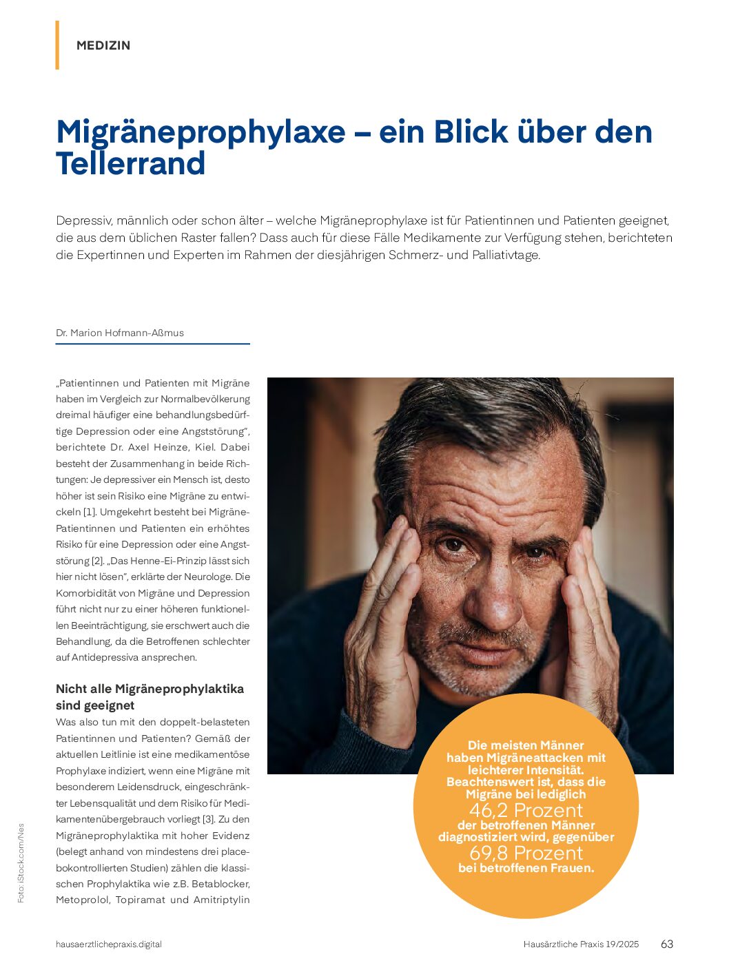 “Männer mit Migräne haben einen doppelten Leidensdruck – einmal durch die wiederkehrenden Kopfschmerzattacken, aber auch dadurch, dass sie als Männer unter einer Frauenerkrankung leiden und sich stigmatisiert fühlen”, erläuterte Dr. Katja Heinze-Kuhn aus Kiel.