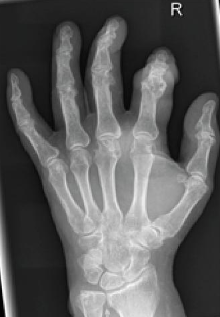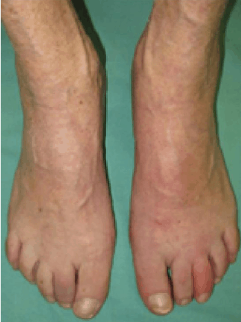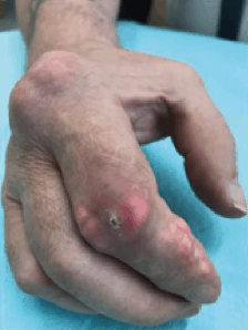 Nicht immer lässt sich die Diagnose einfach stellen. Besonders dann, wenn nicht das typische Metatarsophalagealgelenk I (klassische Podagra) betroffen ist oder wenn symmetrisch erscheinende Schwellungen und Entzündungen von z. B. den Hand- oder Fingergelenken auftreten (Abbildung 1). Vor allem bei jahrelang unbehandelter Gicht führen fortschreitende Harnsäurekristall-Ablagerungen zu Tophi (Abb. 2 und 3).
