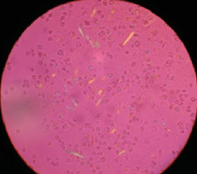 In solchen Fällen hebt die S2e-Leitlinie “Gicht – fachärztlich” der Deutschen Gesellschaft für Rheumatologie (DGRH) die diagnostische Gelenkpunktion zur Diagnosestellung als Goldstandard hervor (Abb. 4) [7]. Dafür ist die partnerschaftliche Zusammenarbeit mit einem Rheumatologen wünschenswert, über den sich in der Regel eine zeitnahe Gelenksonografie und Gelenkpunktion mit mikroskopischem Nachweis von Harnsäurekristallen (oder Abgrenzung der CPPD-Kristalle, die eine ähnliche Klinik verursachen können) realisieren lässt (Abb. 3B und C). Durch die mikrobiologische Untersuchung der Gelenkflüssigkeit lässt sich auch eine septische Arthritis (Notfall!) differenzialdiagnostisch ausschließen.