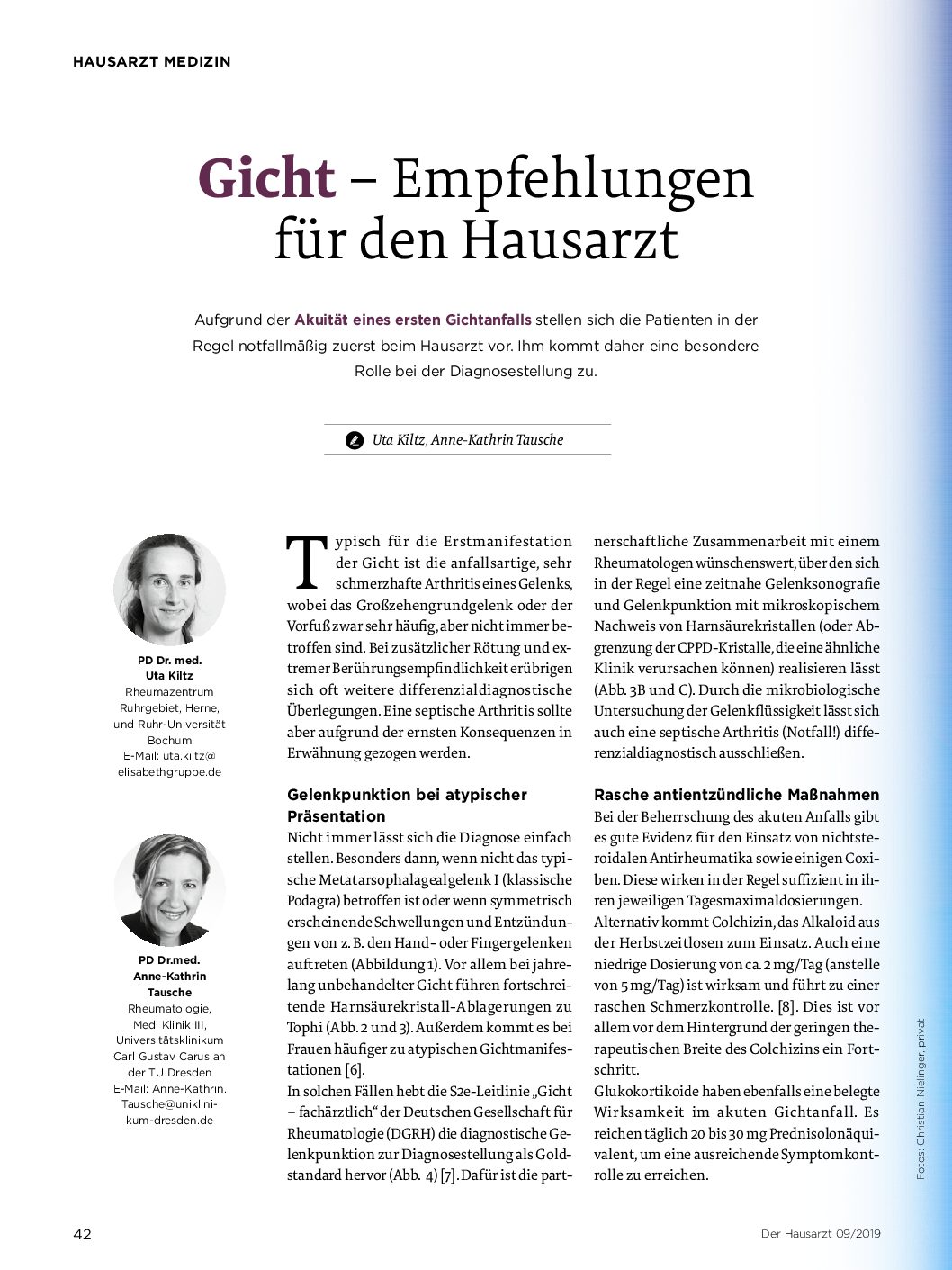 Mögliche Interessenkonflikte: Anne-Kathrin Tausche erhielt Honorare für Beratertätigkeit und Vorträge von Berlin-Chemie Menarini, Novartis und Grünenthal. Uta Kiltz erhielt Berater- und/oder Referentenhonorare von AbbVie, Chugai, Eli Lilly, Grünenthal, Janssen, MSD, Novartis, Pfizer, Roche and UCB sowie Forschungsunterstützung (unrestricted grant) von Abbvie, Biogen, Novartis und Pfizer. Beide Autorinnen betreuen z. T. schwer sowie kompliziert an Gicht erkrankte Patienten und waren an der Erstellung von Gicht-Leitlinien beteiligt.