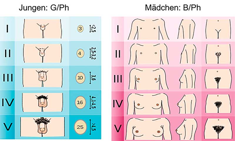 Zur Überprüfung der Pubertätsentwicklung gehört die Beurteilung der Schamhaarentwicklung, bei Mädchen die Brustentwicklung und bei Jungen die Entwicklung und Auffälligkeiten an Penis (Phimose) und Hoden. Desweiteren sollte über ein regelmäßiges, selbstständiges Abtasten der Hoden aufgeklärt werden, um Veränderungen frühzeitig festzustellen. Zur Beurteilung von körperlichen Entwicklungsstadien dienen die Tanner-Stadien.