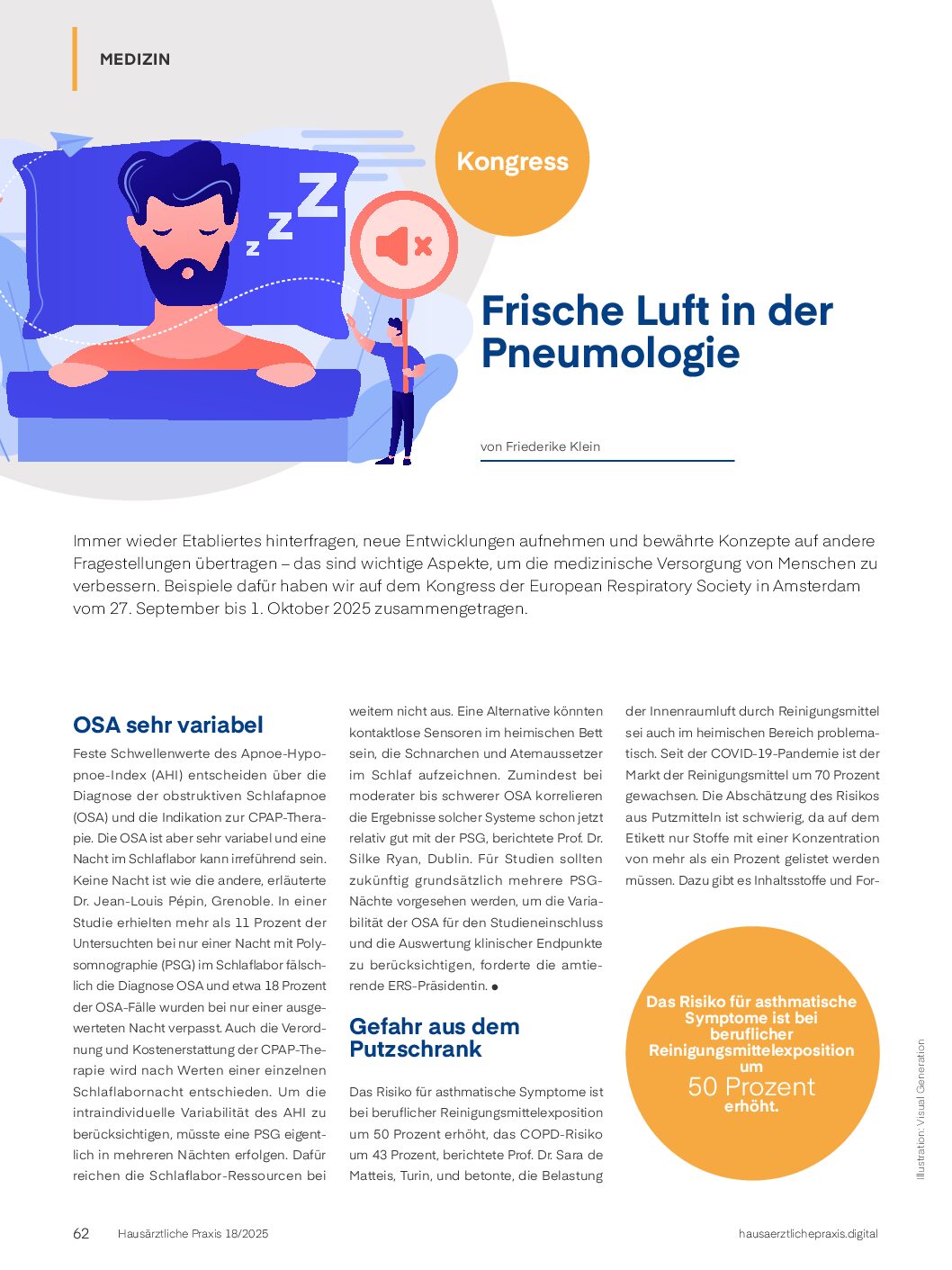 Auch Gesundheitsberufe sind von der Gefahr aus Reinigungsmitteln betroffen. In der Nurses‘ Health Study II zeigte sich eine signifikante Assoziation von Desinfektionsmittelexposition und COPD und explizit auch zwischen der Verwendung von Sprühprodukten und COPD [4]. De Matteis ist überzeugt, dass Reinigungsmittel weltweit eine völlig unterschätzte Quelle für die Luftverschmutzung in Innenräumen sind.