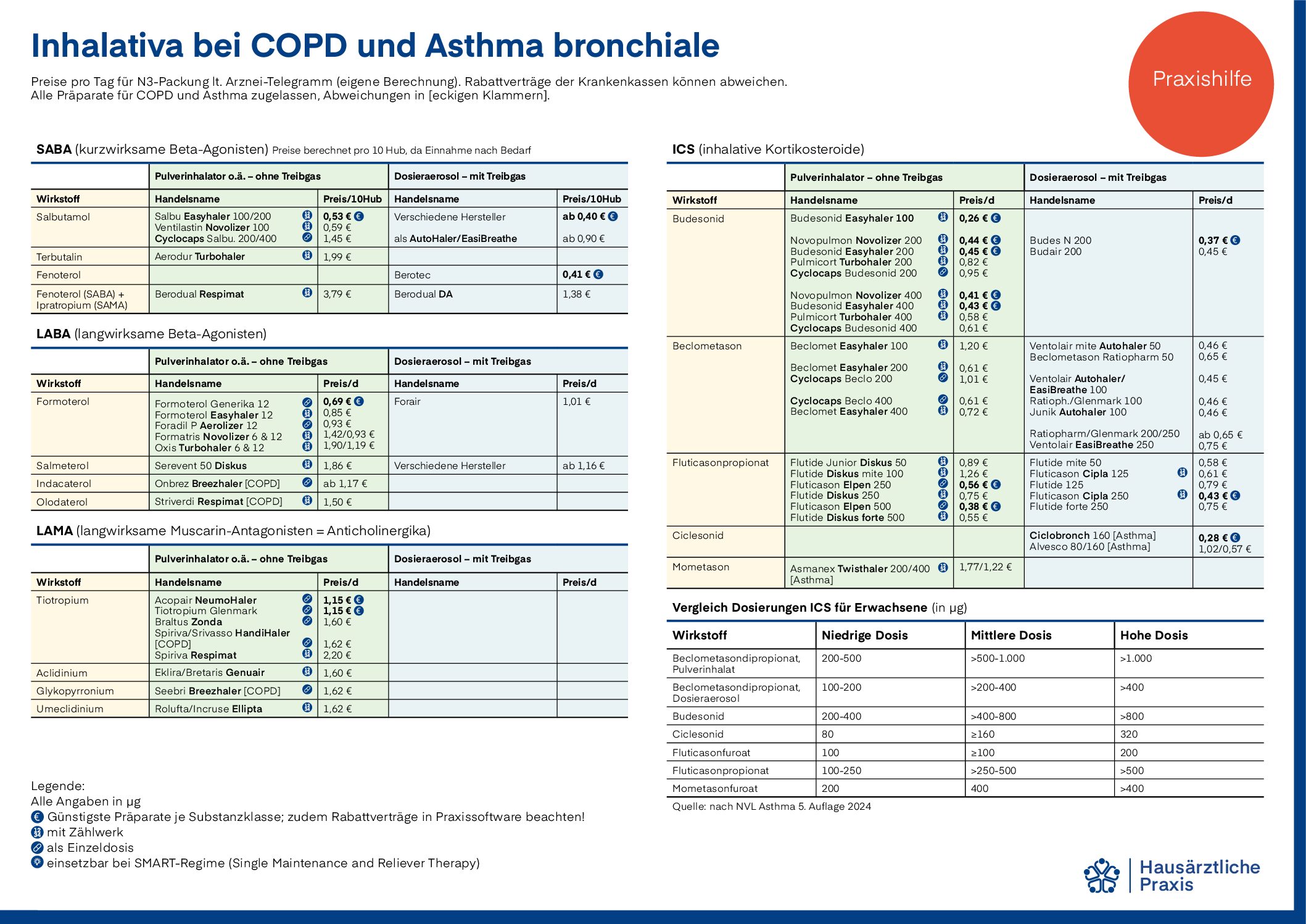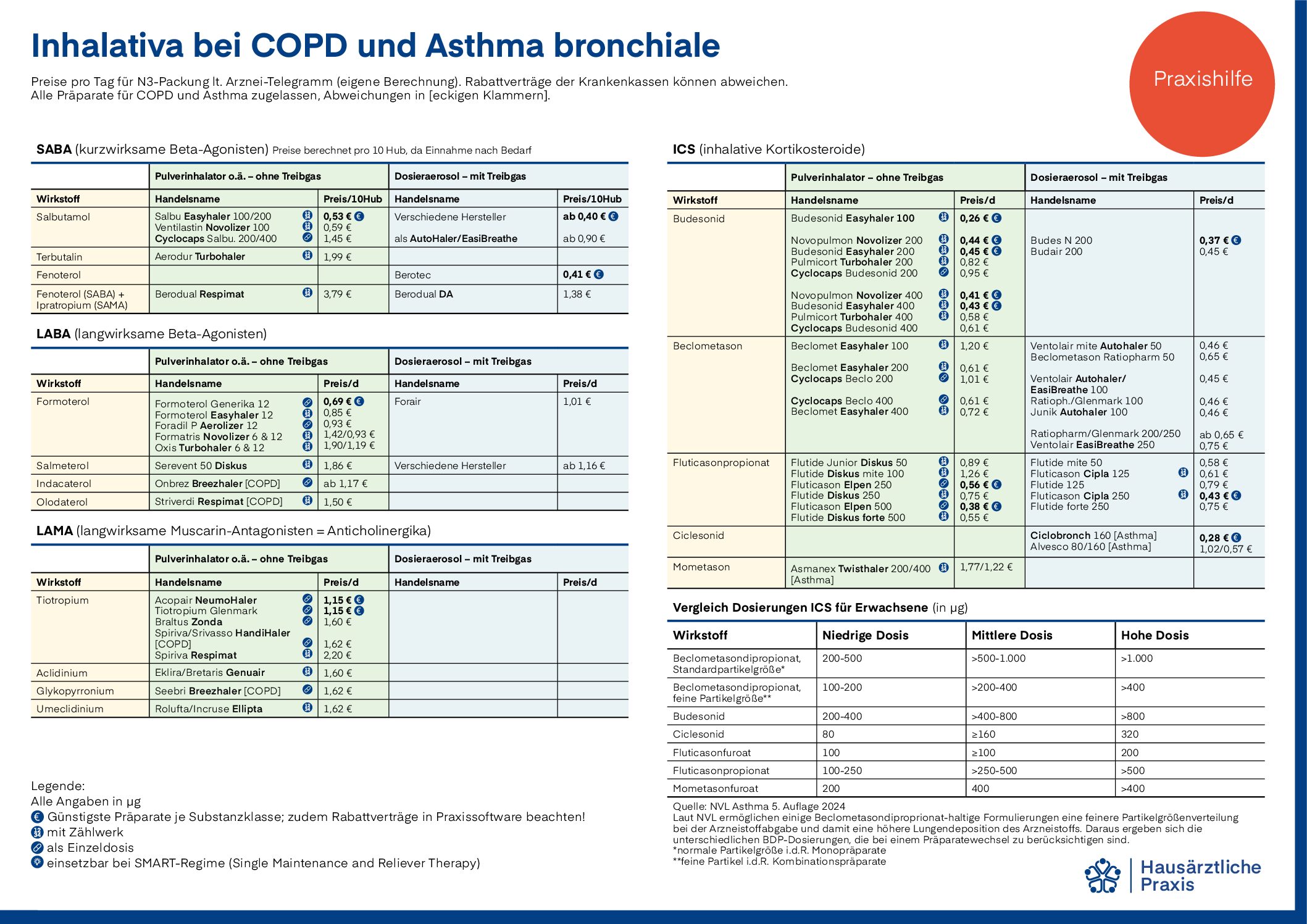 Die neue Praxishilfe Inhalativa (s. Kasten) enthält nicht nur die einzelnen Medikamentenklassen mit Einzelsubstanzen, sondern auch deren Preise (auf Basis des Arznei-Telegramms). Dabei sind die jeweils günstigsten Präparate mit einem Eurozeichen hervorgehoben. Bei der Verordnung schaut sich Frize auch die Rabattverträge der Krankenkassen an, die in der Tabelle nicht berücksichtigt sind. Ansonsten versucht er vorzugsweise das günstigste Präparat zu verordnen.