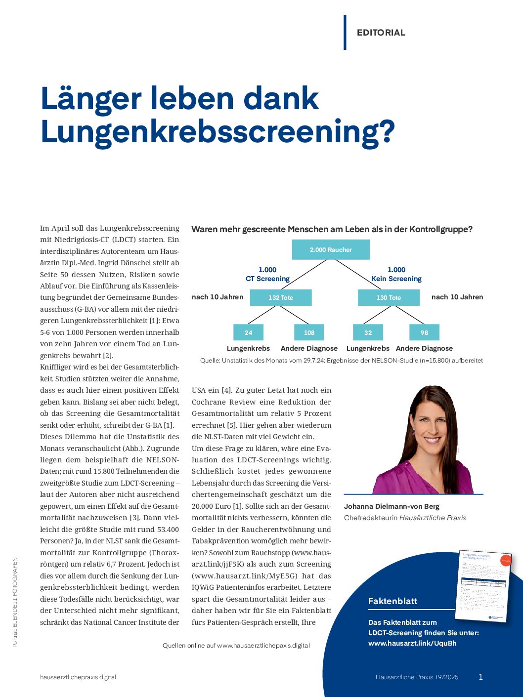 Im April soll das Lungenkrebsscreening mit Niedrigdosis-CT (LDCT) starten. Ein interdisziplinäres Autorenteam um Hausärztin Dipl.-Med. Ingrid Dänschel stellt ab Seite 50 dessen Nutzen, Risiken sowie Ablauf vor. Die Einführung als Kassenleistung begründet der Gemeinsame Bundesausschuss (G-BA) vor allem mit der niedrigeren Lungenkrebssterblichkeit [1]: Etwa 5-6 von 1.000 Personen werden innerhalb von zehn Jahren vor einem Tod an Lungenkrebs bewahrt [2].