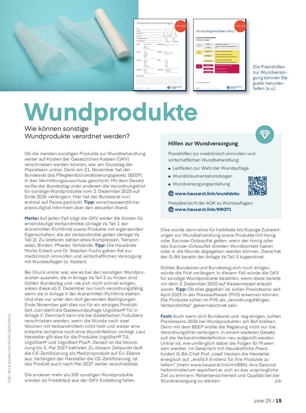 Fazit: Auch wenn sich Bundesrat und -tag einigen, sollten Praxisteams 2026 bei Wundprodukten am Ball bleiben. Denn mit dem BEEP wollte die Regierung nicht nur die Verordnungsfrist verlängern. In einem weiteren Gesetz soll die Verbandmitteldefinition neu aufgerollt werden. Unklar ist, wie umfänglich dabei die Folgen für Praxen sein werden. Im Gespräch mit Hausärztliche Praxis fordert G-BA-Chef Prof.