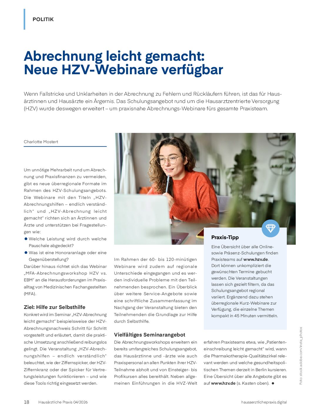 Neben allgemeinen Einführungen in die HVZ-Welt erfahren Praxisteams etwa, wie “Patienteneinschreibung leicht gemacht” wird, wann die Pharmakotherapie-Qualitätszirkel relevant werden und welche gesundheitspolitischen Themen derzeit in Berlin kursieren. Eine Übersicht über alle Angebote gibt es auf www.hzv.de (s. Praxis-Tipp).