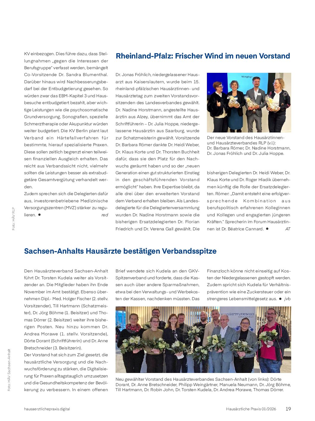 Den Hausärzteverband Sachsen-Anhalt führt Dr. Torsten Kudela weiter als Vorsitzender an. Die Mitglieder haben ihn Ende November im Amt bestätigt. Ebenso übernehmen Dipl.- Med. Holger Fischer (2. stellv. Vorsitzender), Till Hartmann (Schatzmeister), Dr. Jörg Böhme (1. Beisitzer) und Thomas Dörrer (2. Beisitzer) weiter ihre bisherigen Posten. Neu hinzu kommen Dr. Andrea Morawe (1. stellv. Vorsitzende), Dörte Dorant (Schriftführerin) und Dr. Anne Bretschneider (3. Beisitzerin).