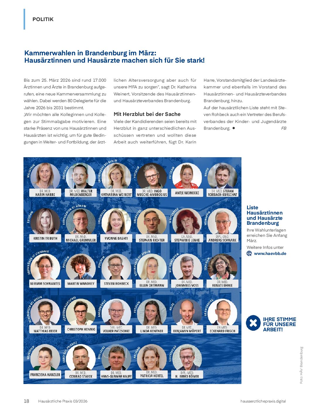 Liste Hausärztinnen und Hausärzte BrandenburgIhre Wahlunterlagen erreichen Sie Anfang März.Weitere Infos unter www.haevbb.de.