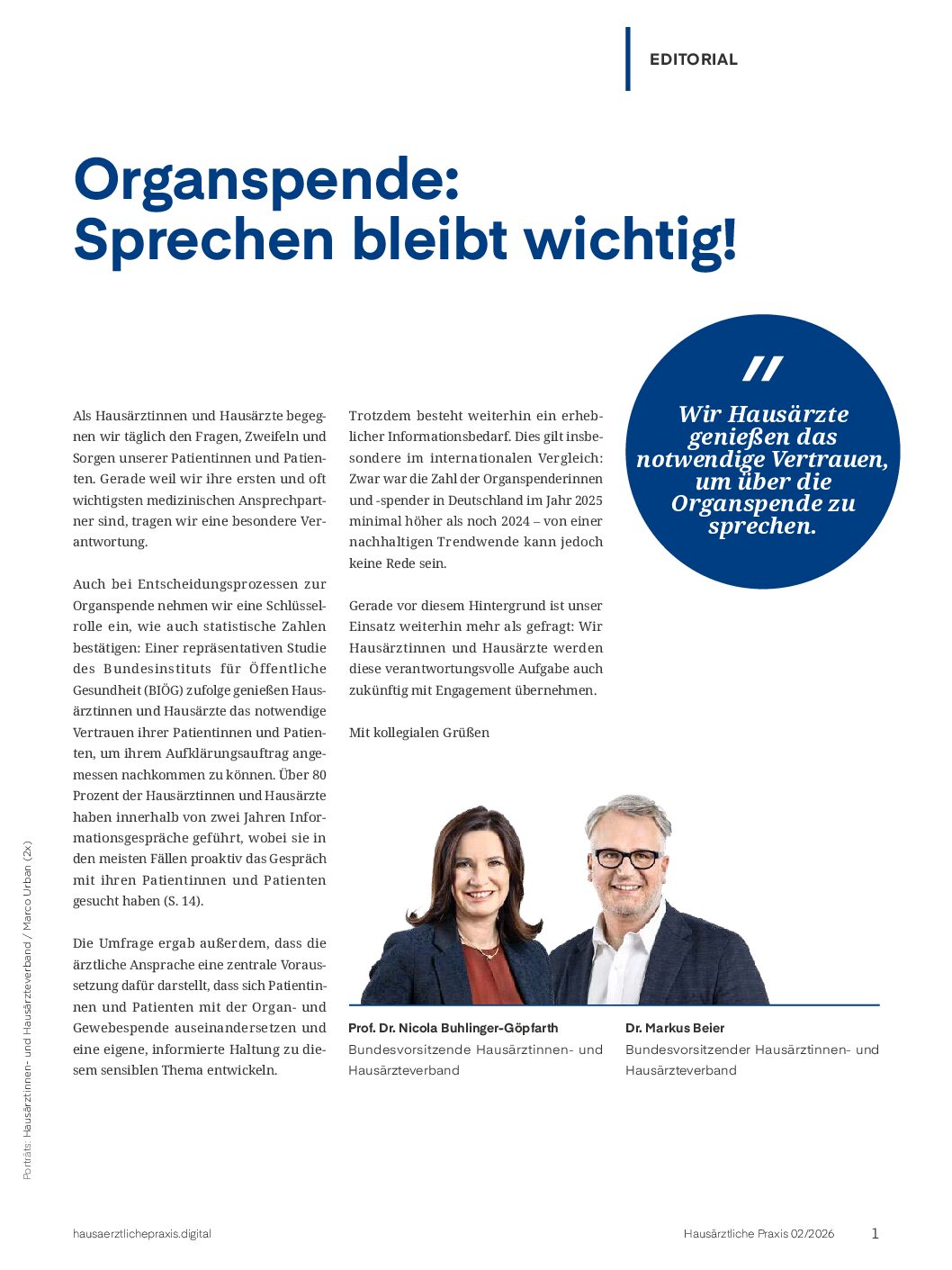 Auch bei Entscheidungsprozessen zur Organspende nehmen wir eine Schlüsselrolle ein, wie auch statistische Zahlen bestätigen: Einer repräsentativen Studie des Bundesinstituts für Öffentliche Gesundheit (BIÖG) zufolge genießen Hausärztinnen und Hausärzte das notwendige Vertrauen ihrer Patientinnen und Patienten, um ihrem Aufklärungsauftrag angemessen nachkommen zu können.