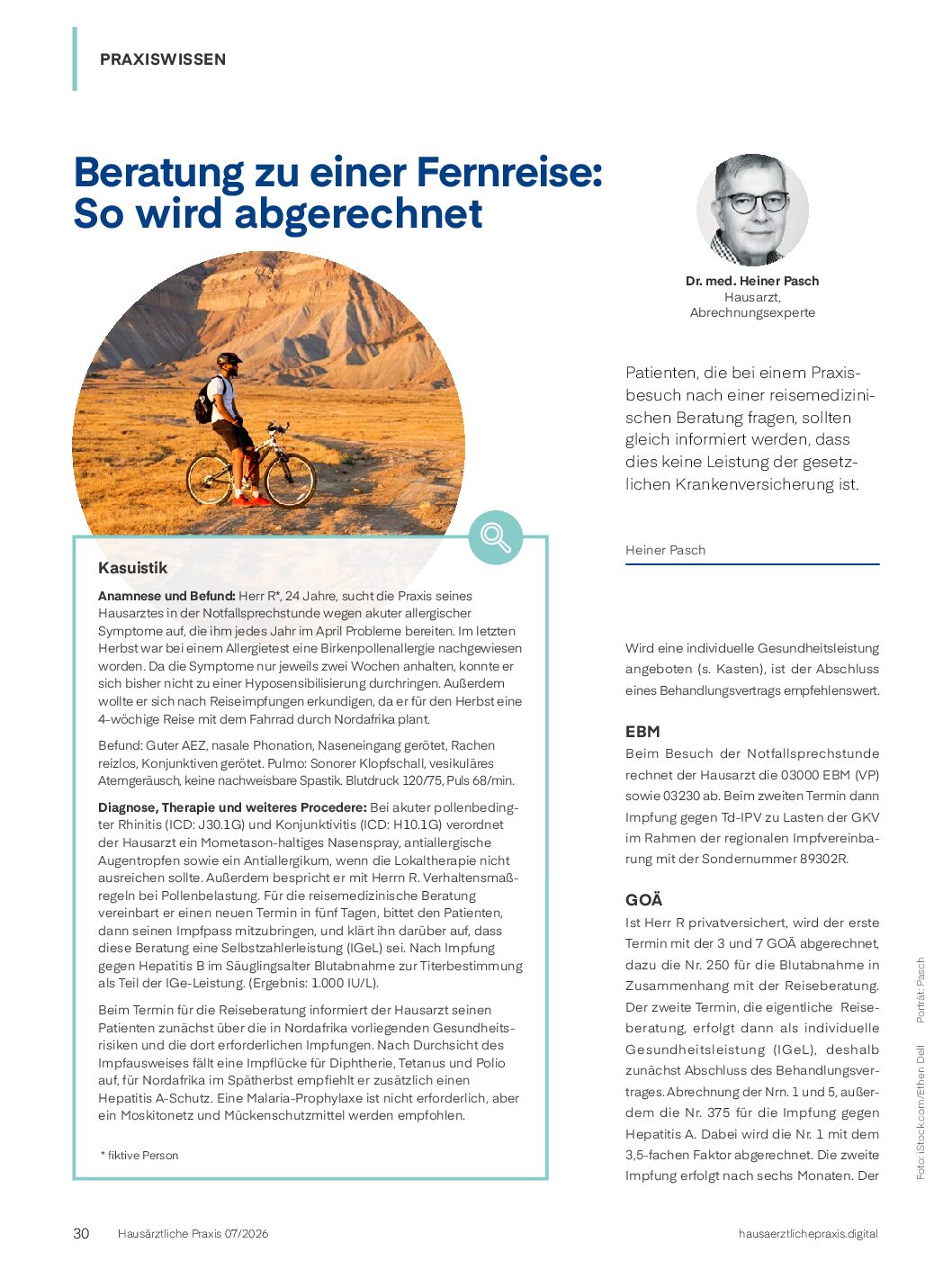 Ist Herr R. privatversichert, wird der erste Termin mit der 3 und 7 GOÄ abgerechnet, dazu die Nr. 250 für die Blutabnahme in Zusammenhang mit der Reiseberatung. Der zweite Termin, die eigentliche Reiseberatung, erfolgt dann als individuelle Gesundheitsleistung (IGeL), deshalb zunächst Abschluss des Behandlungsvertrages.