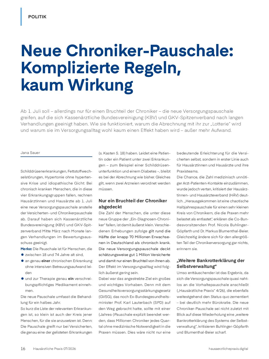 Die neue Chroniker-Pauschale sei nicht zuletzt mit Blick auf diese Wiederholung eine “weitere Bankrotterklärung des Systems der Selbstverwaltung”, kritisieren Buhlinger-Göpfarth und Blumenthal-Beier scharf.