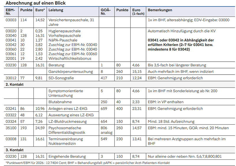 Ein LZ-EKG und eine LZ-Blutdruckmessung werden mit den Nrn. 659 und 654 abgerechnet. Hinzu kommt die 806 analog für den Ausschluss einer psychosomatischen Problematik. Zur Schlussbesprechung nach Vorliegen der in der Praxis erhobenen und auswärtigenBefunde kommt noch die Nr. 3 zur Abrechnung.