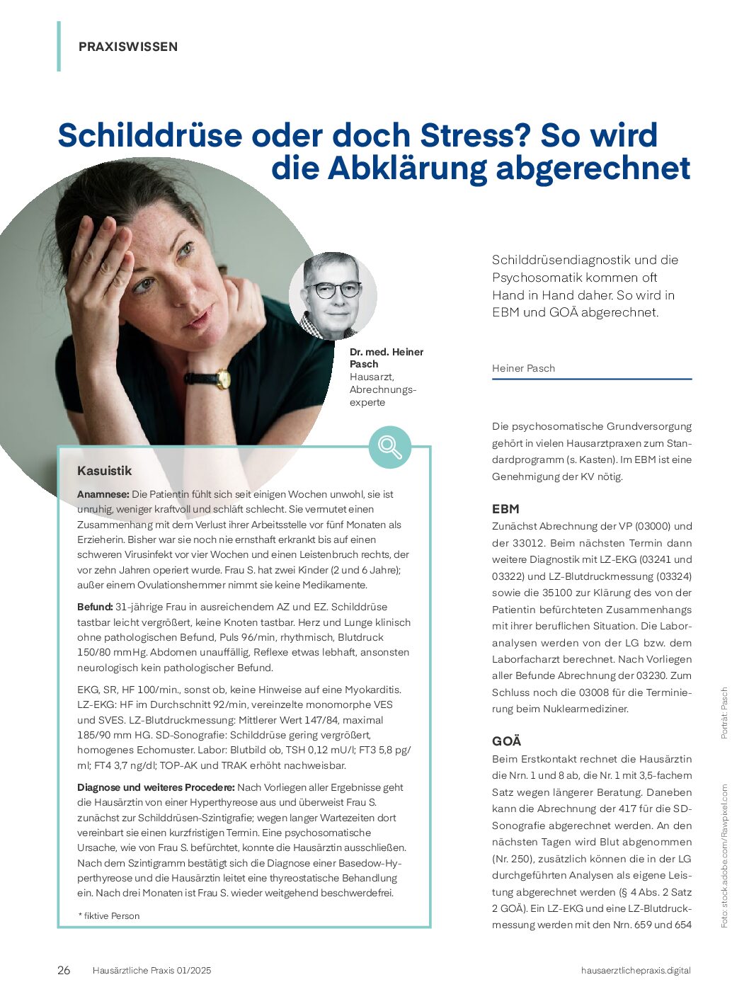 Zunächst Abrechnung der VP (03000) und der 33012. Beim nächsten Termin dann weitere Diagnostik mit LZ-EKG (03241 und 03322) und LZ-Blutdruckmessung (03324) sowie die 35100 zur Klärung des von der Patientin befürchteten Zusammenhangs mit ihrer beruflichen Situation.