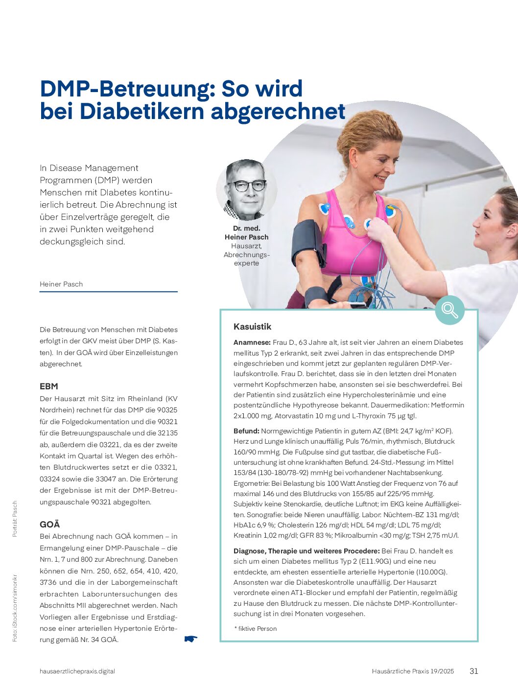 Wegen des erhöhten Blutdruckwertes setzt er die 03321, 03324 sowie die 33047 an. Die Erörterung der Ergebnisse ist mit der DMP-Betreuungspauschale 90321 abgegolten.