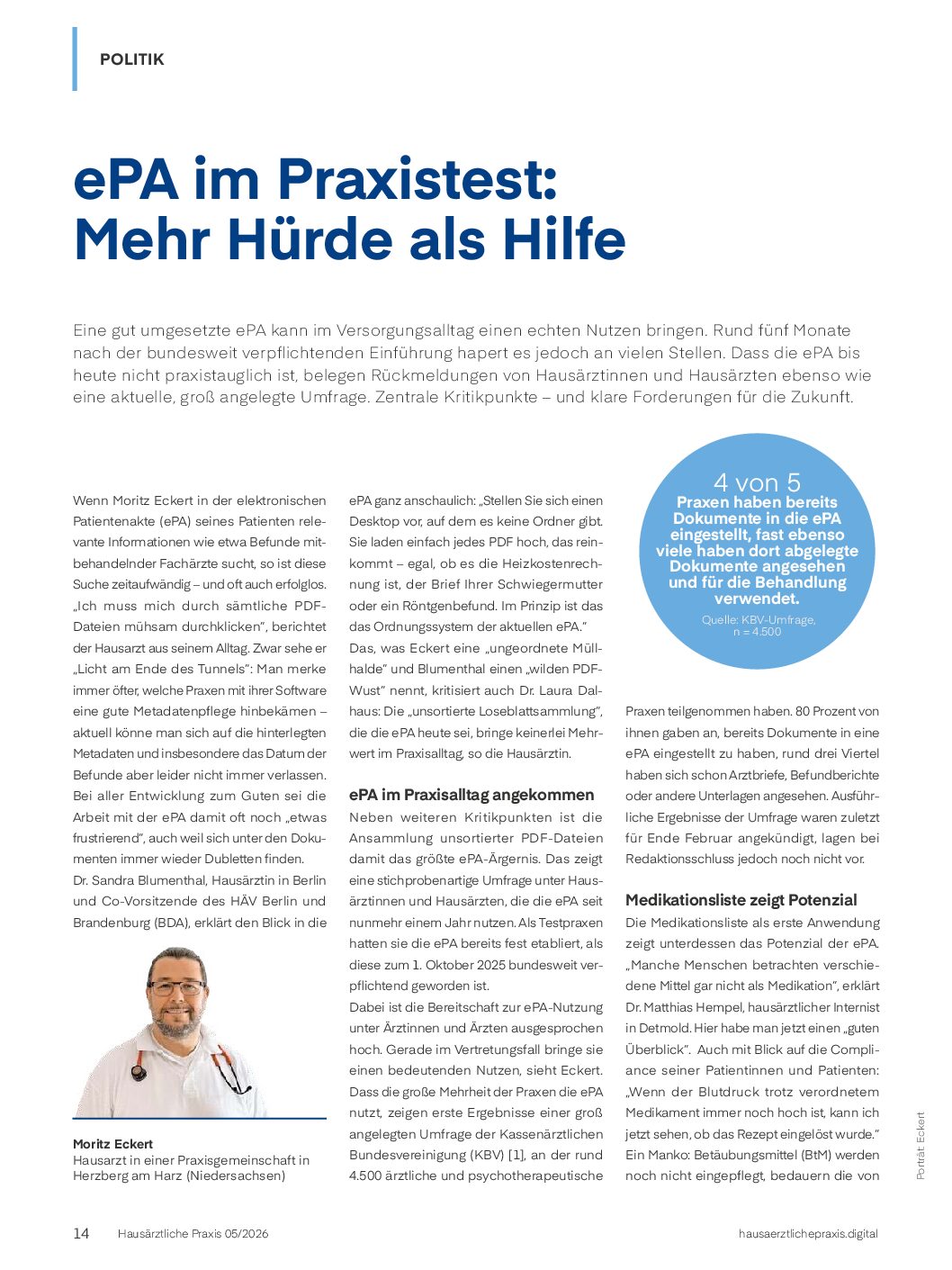 - Rückmeldungen aus diesen Testpraxen zeigen, dass die ePA mittlerweile fester Bestandteil der Praxisabläufe ist – und gleichzeitig zentrale Kritikpunkte: die Unübersichtlichkeit der PDF-Dateien, die Nichtbeteiligung von Kliniken sowie regelmäßige Technik-Ausfälle. Dies belegt auch eine aktuelle Umfrage der KBV.