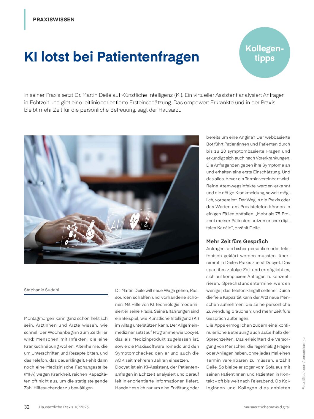 Da die KI von Docyet dazulernt, verbessere sich die Qualität der Vorschläge kontinuierlich. Gerade bei chronischen Erkrankungen, die regelmäßige Kontrollen und Anpassungen erfordern, sieht Deile einen Vorteil.