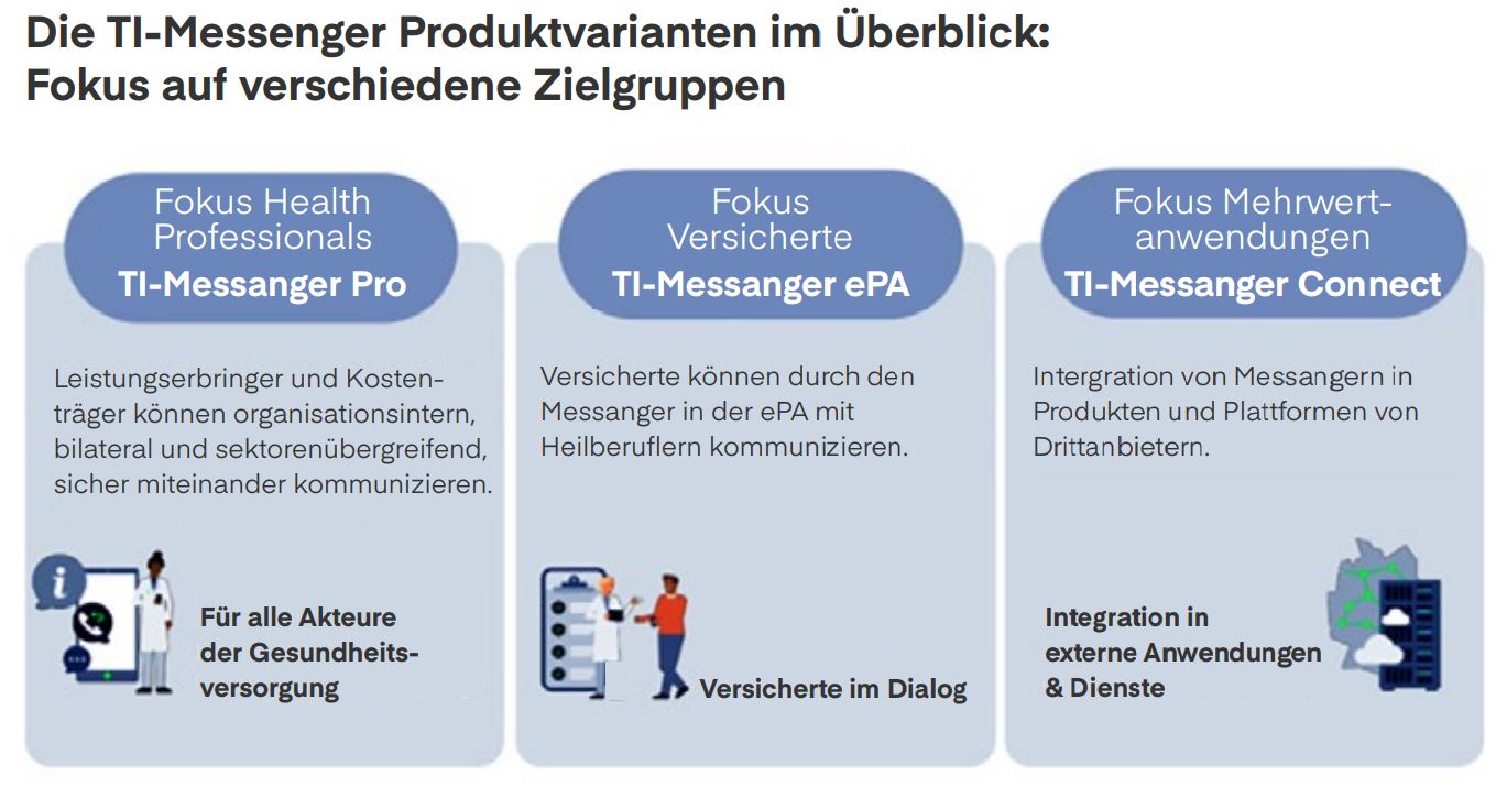 Perspektivisch soll TIM weiterentwickelt werden (s. Abb. unten). Der Fahrplan der Gematik sieht nach dem bereits vorhandenen TI-Messenger Pro (der Fokus liegt auf Health Professionals, also der Kommunikation unter Ärzten, Apotheken etc.) und dem TI-Messenger in der ePA (schrittweise Einführung seit Juli mit dem Fokus Versicherte bzw. Kommunikation mit Patienten) ab 2026 den TI-Messenger Connect (Fokus Mehrwertanwendungen) vor.