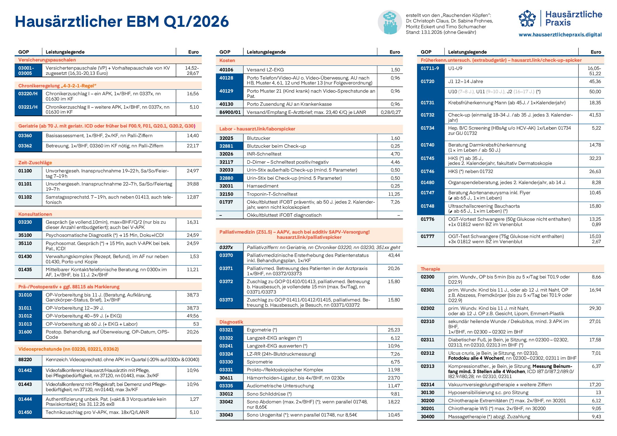 Die "Rauchenden Köpfe" haben den EBM-Spickzettel für das erste Quartal 2026 aktualisiert. Praxisteams können diesen jetzt herunterladen.