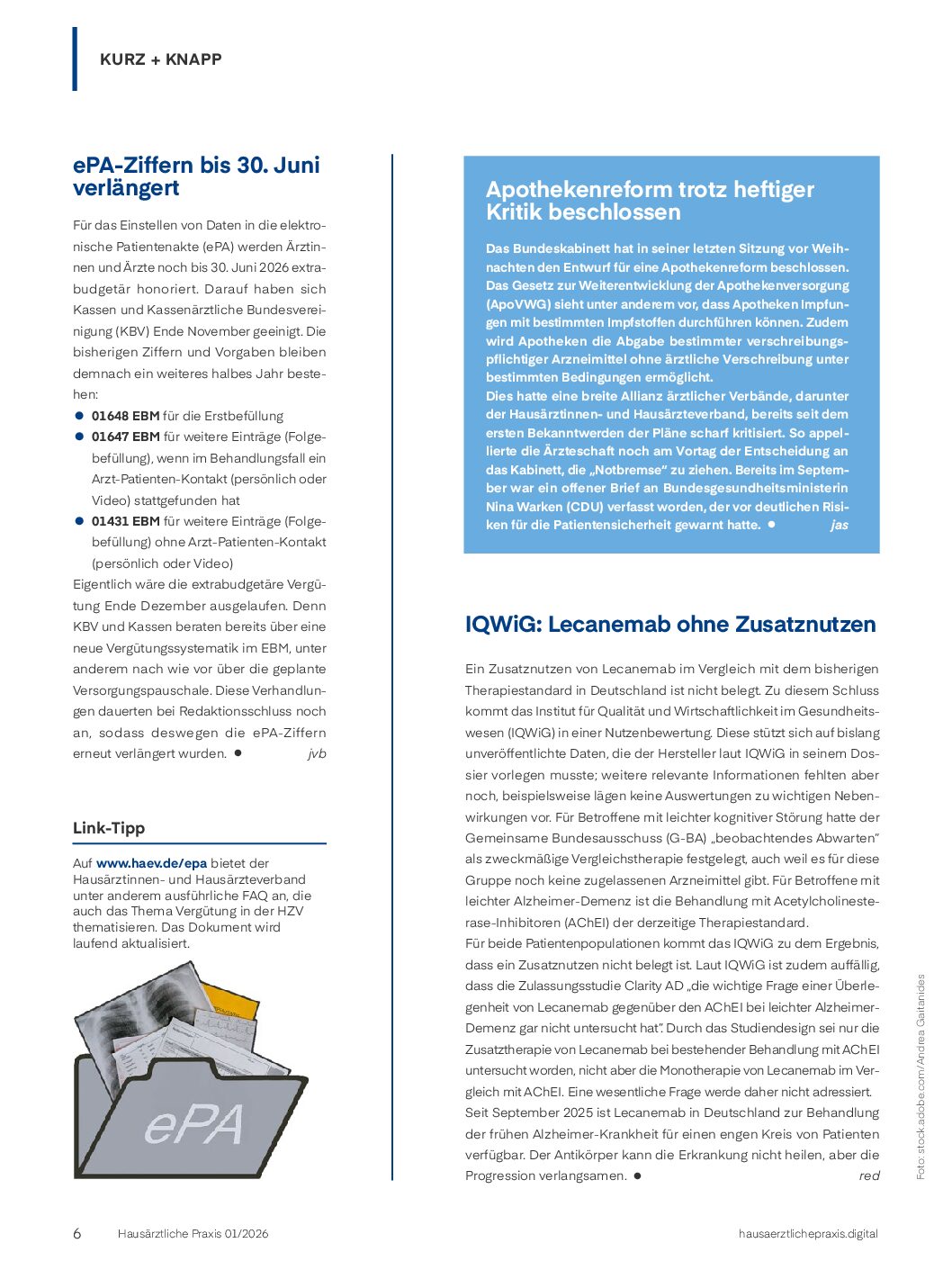 Auf www.haev.de/epa bietet der Hausärztinnen- und Hausärzteverband u. a. ausführliche FAQ an, die auch das Thema Vergütung in der HZV thematisieren. Das Dokument wird laufend aktualisiert. jvb