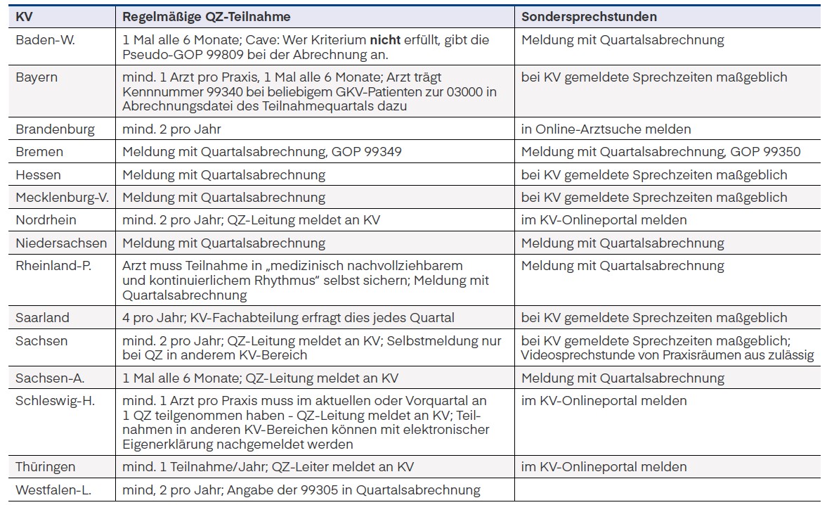 Dieses Kriterium ist für Mitglieder von hausärztlichen Berufsausübungsgemeinschaften (BAG) automatisch erfüllt. Alle anderen, also Einzelpraxen oder Mitglieder von fachübergreifenden BAG, punkten hier durch die regelmäßige Teilnahme an einem Qualitätszirkel (QZ). Regelmäßig heißt laut Qualitätssicherungs-Richtlinie „in der Regel mindestens 4 Sitzungen im Jahr“, erklärt die KBV auf Nachfrage von „Hausärztliche Praxis“. In Thüringen reicht auch mindestens 1 Teilnahme pro Jahr. Meist wird dies per Selbstauskunft an die KV erfasst oder von den QZ-Leitungen gemeldet.