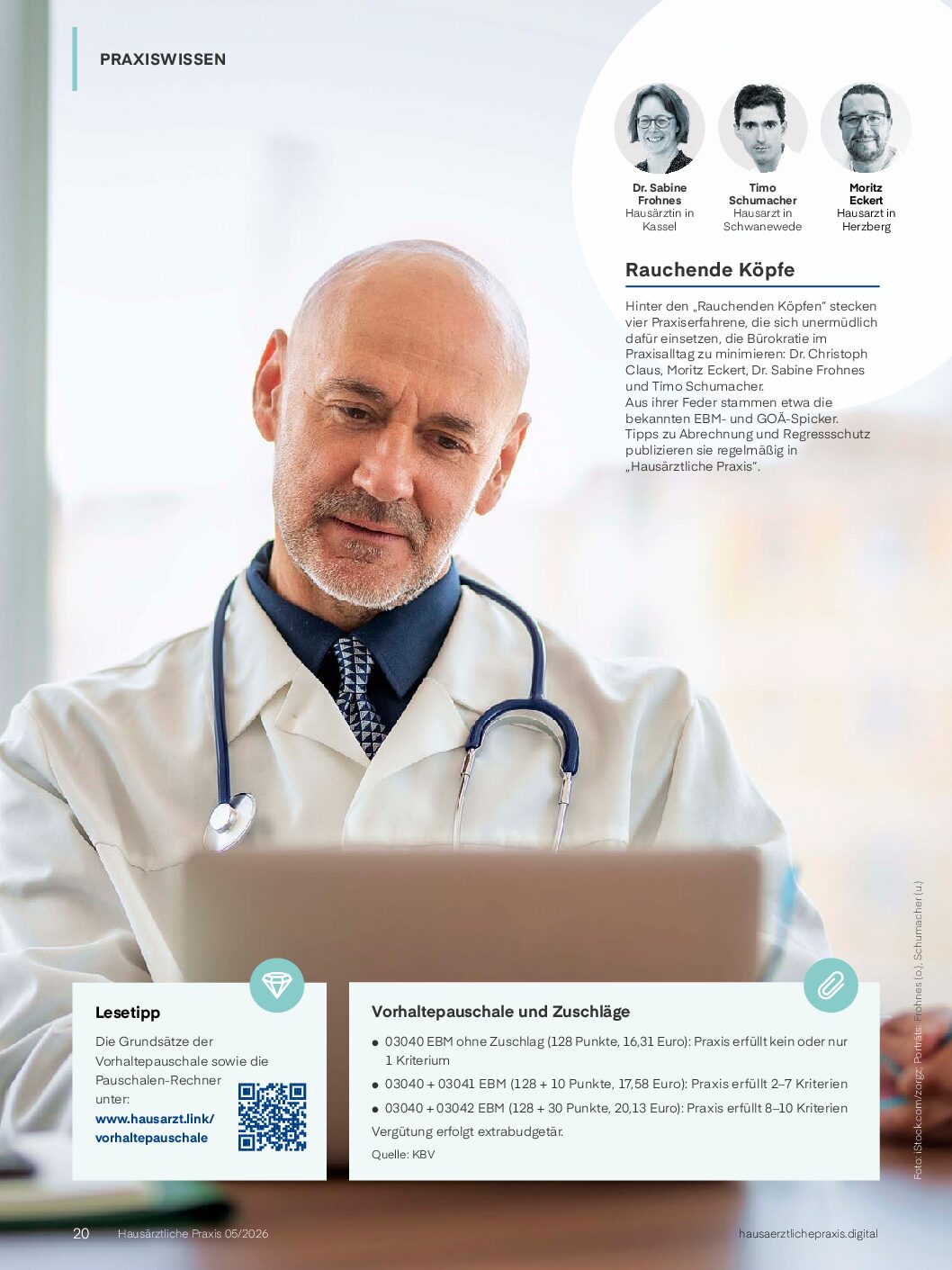 Die neue Vorhaltepauschale im EBM (s. Kasten und Tab. 1) gilt seit 1. Januar und wirft in einigen Praxen Fragen auf, ob oder wie die Kriterien erfüllt werden können. Die Grundsätze sowie einen Pauschalen-Rechner als Excel- oder Onlinevariante haben die „Rauchenden Köpfe“ bereits in „Hausärztliche Praxis“ 4/26 (www.hausarzt.link/vorhaltepauschale) vorgestellt. Zwar werden laut Hochrechnungen die meisten Praxen 2 der 10 Kriterien erfüllen, das eigentliche Ziel des Gesetzgebers, Versorgerpraxen zu stärken, wird aber verfehlt und bringt mehr Abrechnungsbürokratie in die Praxen.