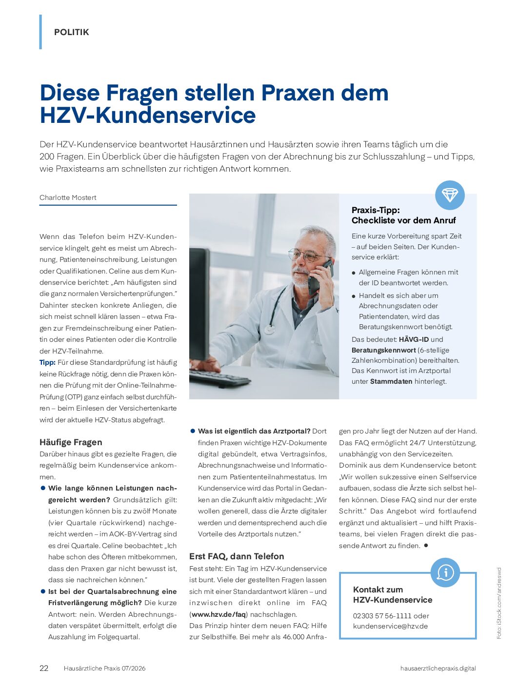 - Was ist eigentlich das Arztportal? Dort finden Praxen wichtige HZV-Dokumente digital gebündelt, etwa Vertragsinfos, Abrechnungsnachweise und Informationen zum Patiententeilnahmestatus. Im Kundenservice wird das Portal in Gedanken an die Zukunft aktiv mitgedacht: “Wir wollen generell, dass die Ärzte digitaler werden und dementsprechend auch die Vorteile des Arztportals nutzen.”