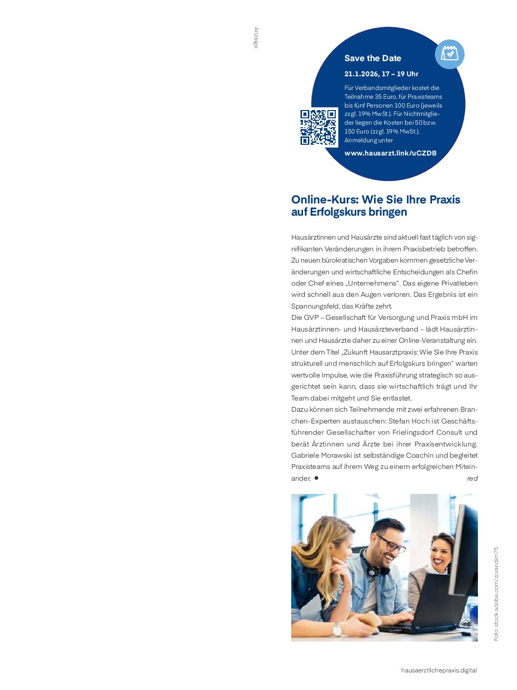 Unter dem Titel “Zukunft Hausarztpraxis: Wie Sie Ihre Praxis strukturell und menschlich auf Erfolgskurs bringen” warten wertvolle Impulse, wie die Praxisführung strategisch so ausgerichtet sein kann, dass sie wirtschaftlich trägt und Ihr Team dabei mitgeht und Sie entlastet.