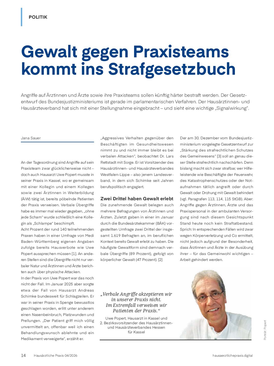“Wir haben daher seit Langem darauf gedrängt, dass zukünftig nicht nur Angriffe auf Rettungskräfte, sondern auch auf niedergelassene Ärztinnen und Ärzte sowie deren Praxisteams härter bestraft werden”, unterstrichen die Co-Bundesvorsitzenden des Hausärztinnen- und Hausärzteverbandes, Prof. Nicola Buhlinger-Göpfarth und Dr. Markus Beier, daher mit Vorlage der Stellungnahme im Januar. Einen entsprechenden Beschluss hatten die Delegierten des Verbandes bei ihrer Frühjahrstagung 2025 gefasst [6]. Auch die Vertreterversammlung der KBV sowie der Deutsche Ärztetag hatten in den vergangenen Jahren wiederholt Handlungsbedarf angemahnt.